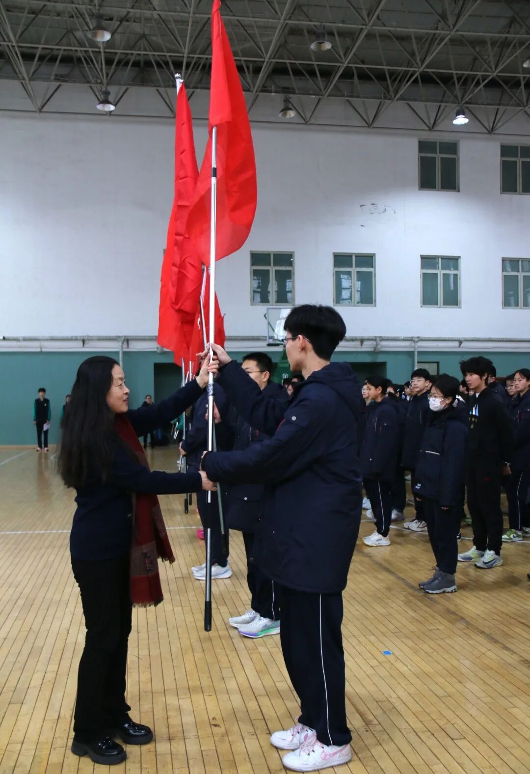 授旗仪式将现场氛围推向**。学校党支部丁利书记将象征荣誉、团结与拼搏的“班超”红色战旗,庄严授予各班级代表。