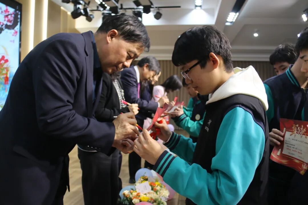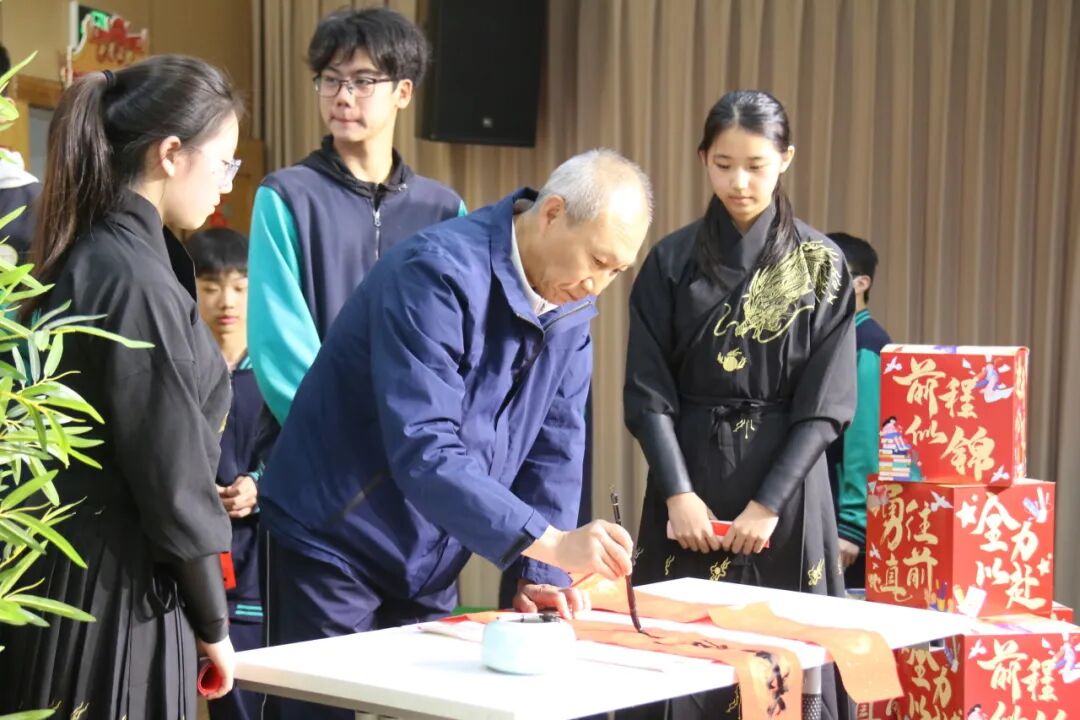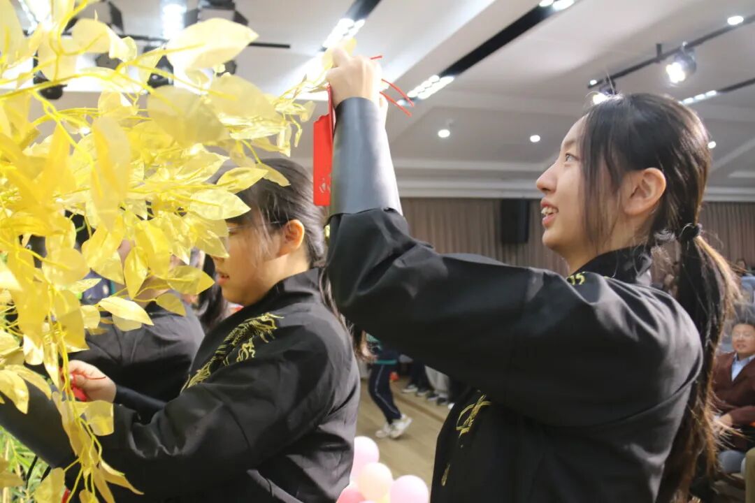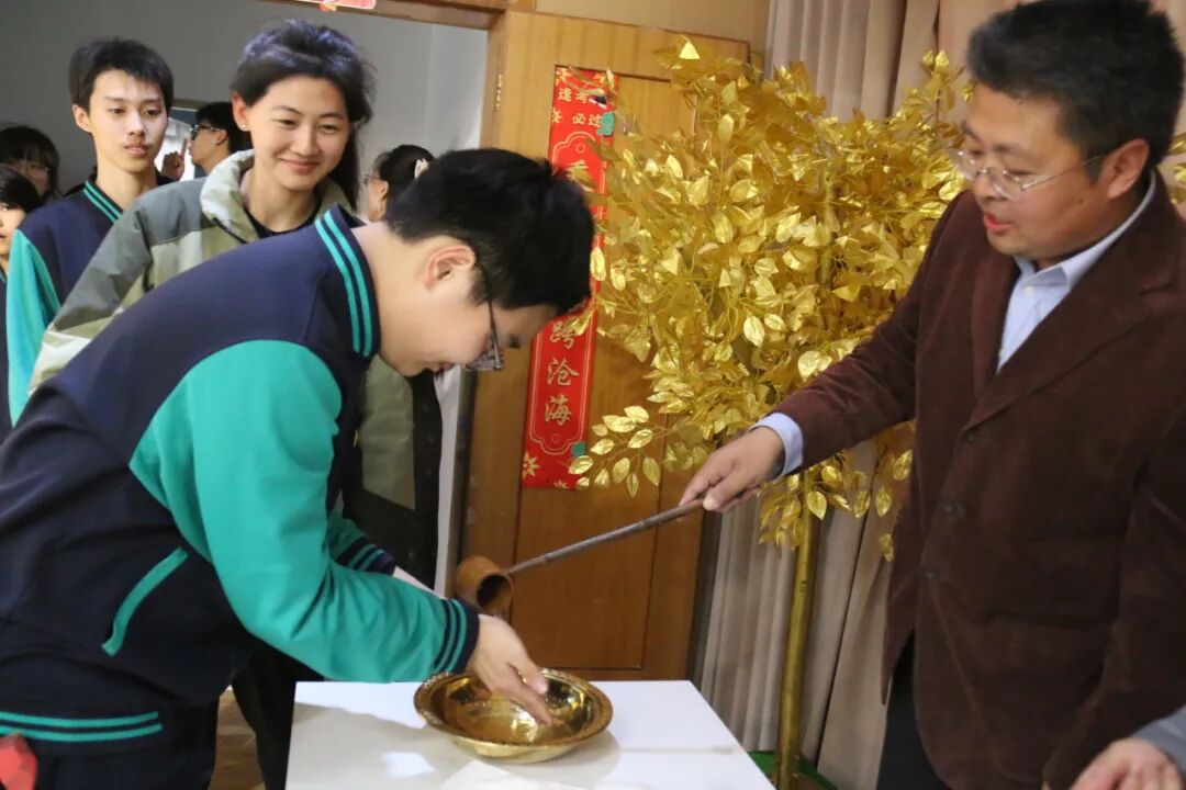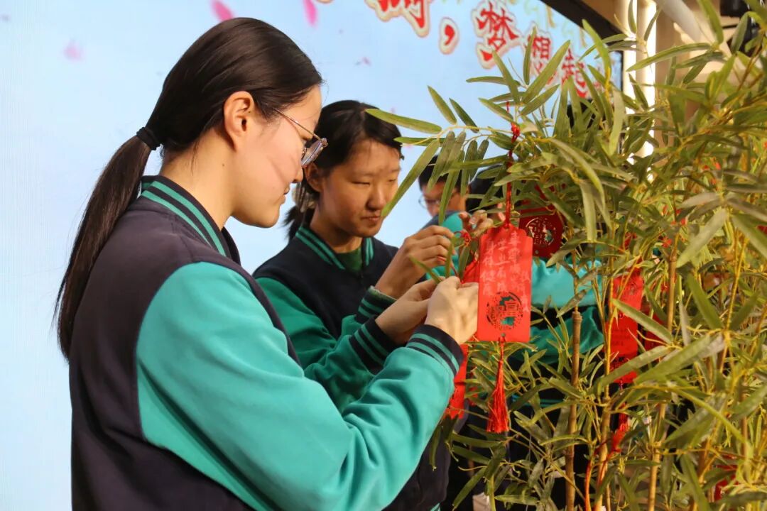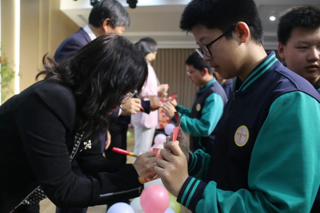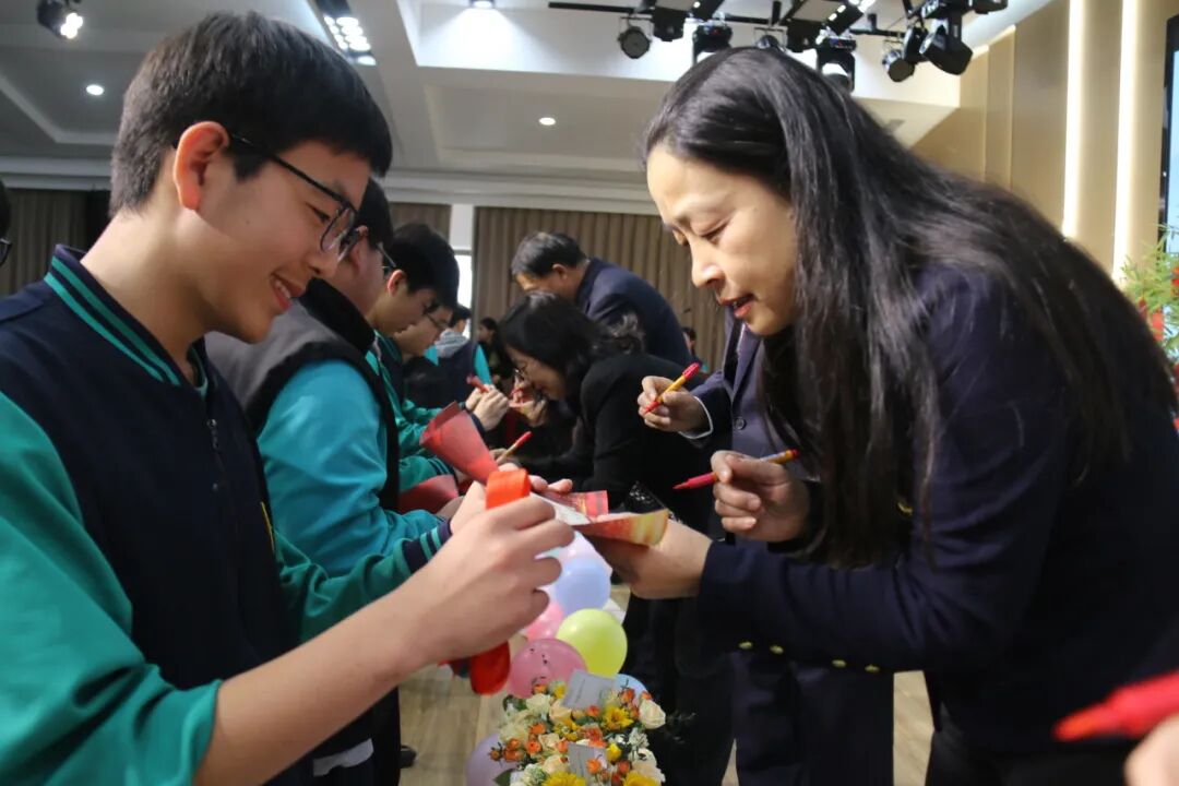 悠扬古筝曲流淌,邱建辉老师现场挥毫泼墨,书写励志对联为学子鼓劲,许愿牌在灯光下熠熠生辉,静待六月绽放芳华。