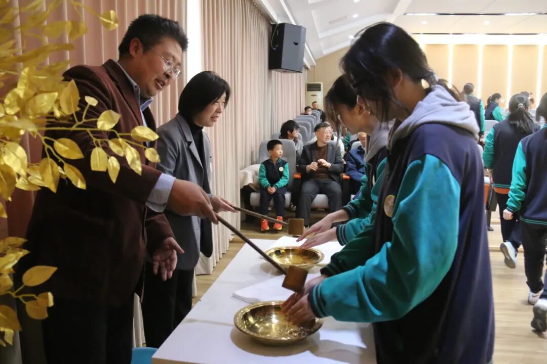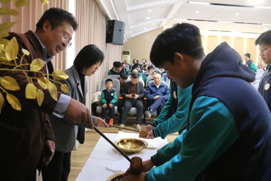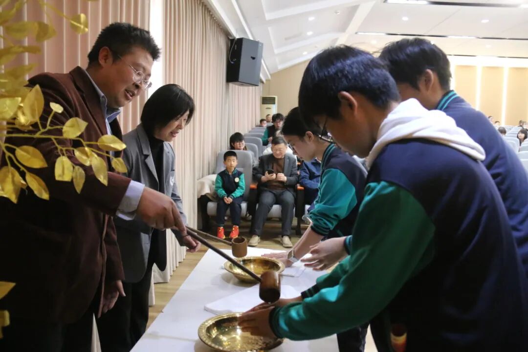 大会以庄重的沃盥礼开篇,礼堂门侧“鲤鱼跃龙门”装饰寓意深远。初三学子列队净手,涤去浮躁、手握纸笔,以澄澈之心踏上中考征途;学校领导亦净手落座,与学子并肩迎战百日挑战。