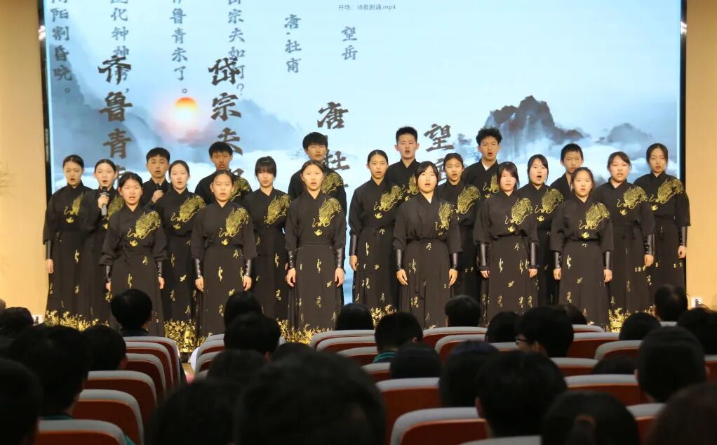 舞台上,学子们依次吟诵《行路难》《望岳》《满江红》,以诗言志、以声传情,从豪迈求索到笃行担当,尽显少年意气。诵至结尾,全场学子起立齐声高诵,古之壮怀与今之志向交融,化作前行的热血力量。