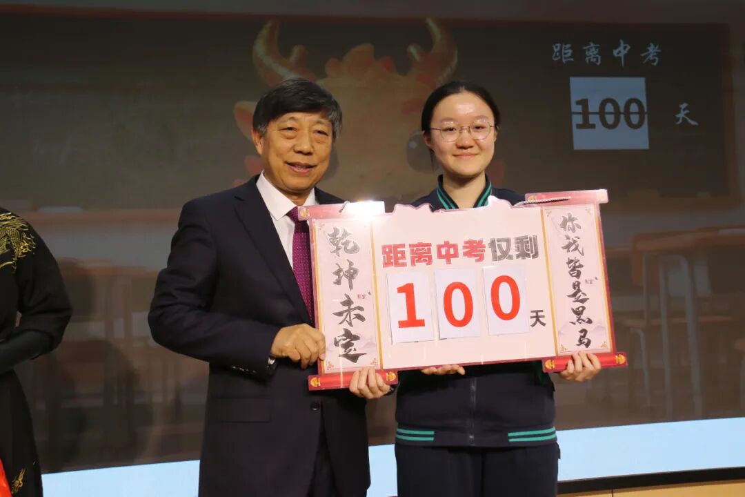 高江涛校长与全场师生共同揭开“百日冲刺”倒计时牌,红绸滑落,醒目的“100”既是时间刻度,更是奋斗号角。