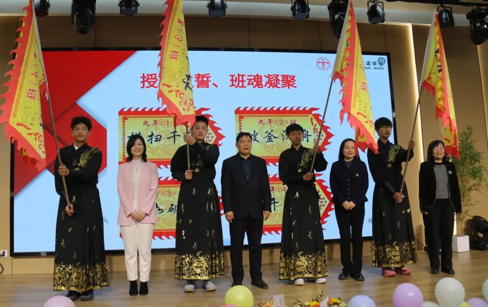 尹校长、丁书记、宋校长、穆校长为四个班级授予战旗,各班代表郑重接过、高举挥舞。猎猎战旗凝聚班魂,百日拼搏的信念融入血脉,战旗所向,便是心之所向、梦之所往。