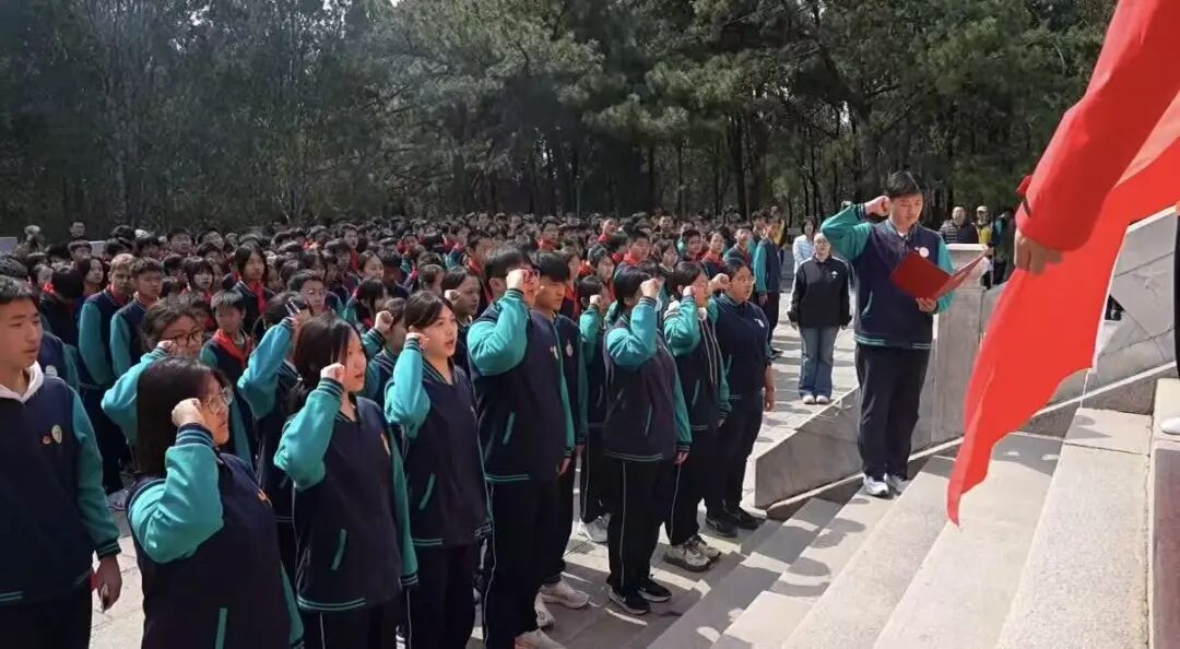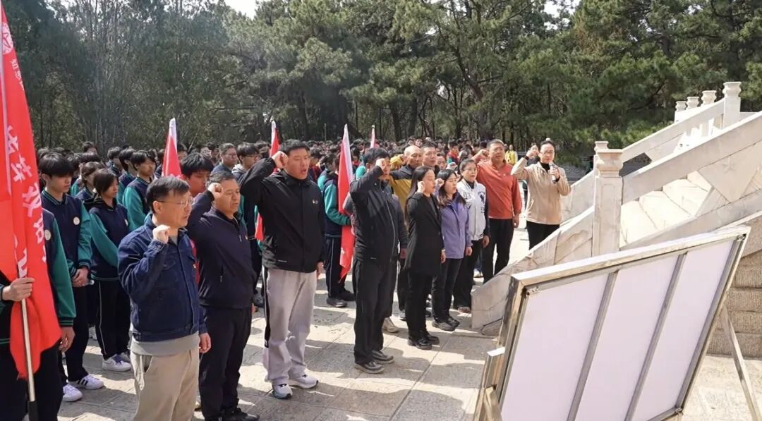 党员教师代表面向英烈纪念碑肃立,面对党旗高举右拳,重温入党誓词。全体团员随后面向团旗,重温入团誓词,以青春之名许下传承英烈精神、勇担时代重任的坚定承诺。