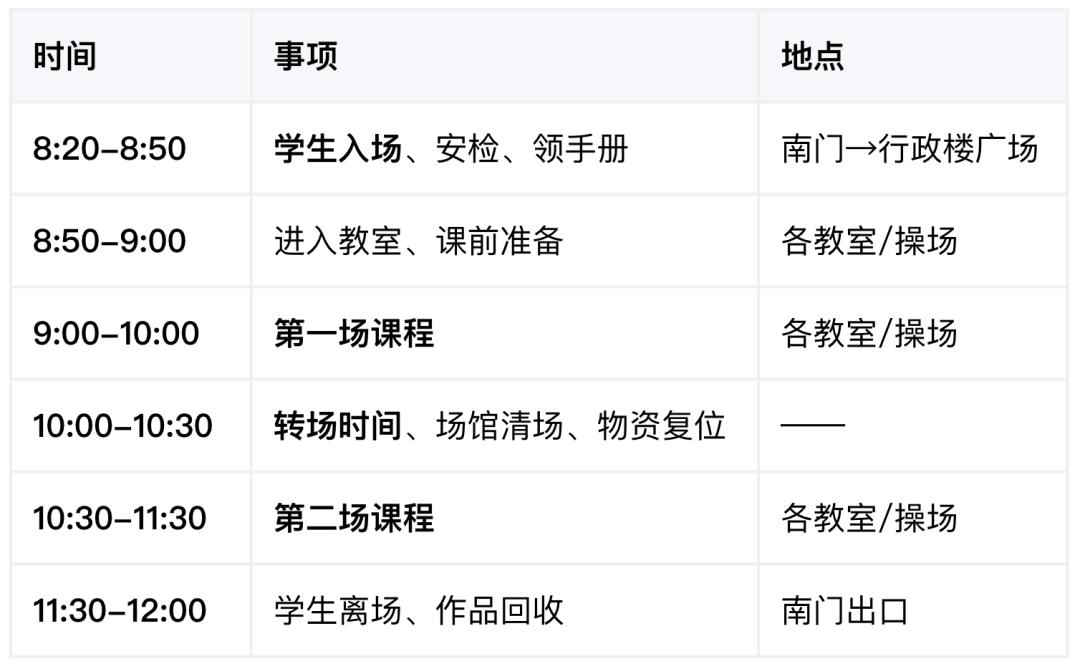 ● 第一场(9:00开始):建议8:20-8:40到达,预留安检、签到、移步至教室的时间