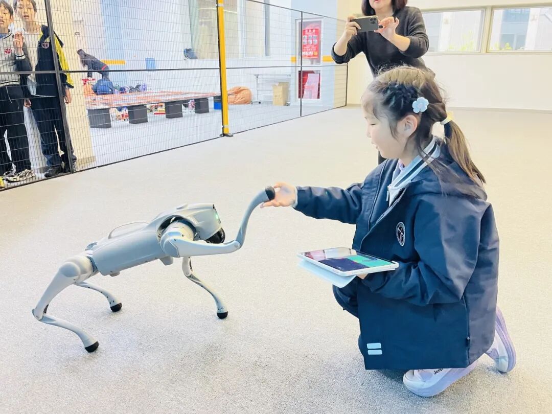 同学们沉浸在丰富多彩的科创体验之中:与灵动的人形机器人、可爱的智能机器狗近距离互动;在VR/AR沉浸式场景中穿梭漫游,切身感受数字科技的奇妙;走进国防科普展区,了解大国重器风采,亲手操控机械臂,触摸智能制造的力量。
