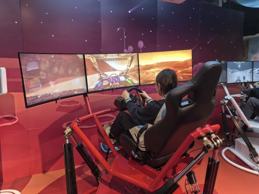 步入星际漫游者航天主题区,漫天星河铺展在眼前。同学们驾驶模拟火星车,奔赴神秘红色星球;戴上VR眼镜,穿梭于太阳系八大行星之间;走进绿幕空间,变身太空探险者,沉浸式解锁宇宙奥秘。科技与艺术相融,幻想与现实相逢,浩瀚宇宙的浪漫与壮阔,尽收眼底。