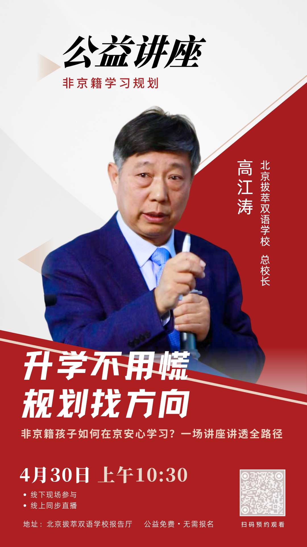 🌟升学不用慌,规划找方向!北京拔萃双语学校总校长高江涛校长,带来「非京籍学习规划」公益讲座。聚焦非京籍孩子在京学习的全路径规划,免费为家长答疑解惑。