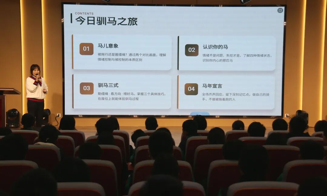 随后,心理教师洪老师以“驯马记——做自己情绪的主人”为题,用生动比喻和实用技巧,帮助同学们学会识别与管理情绪,为心灵注入稳定与力量。