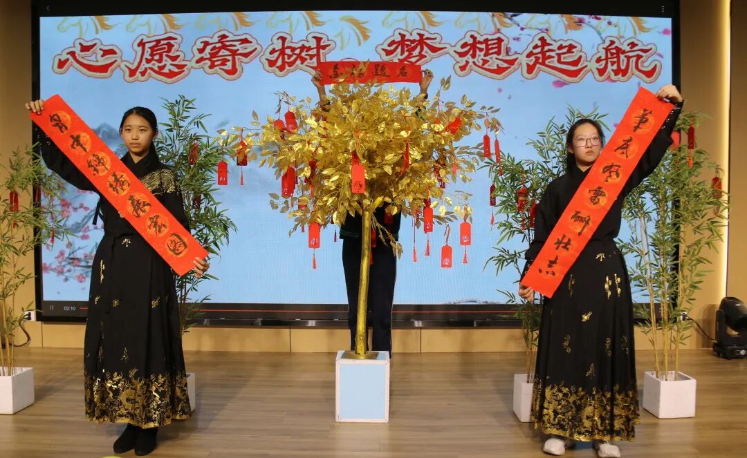 礼堂内,学子们依次登台,将写满目标与期许的许愿牌系于许愿树枝头。