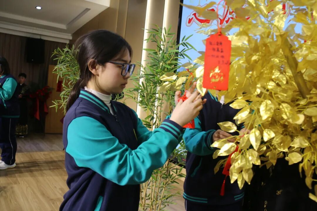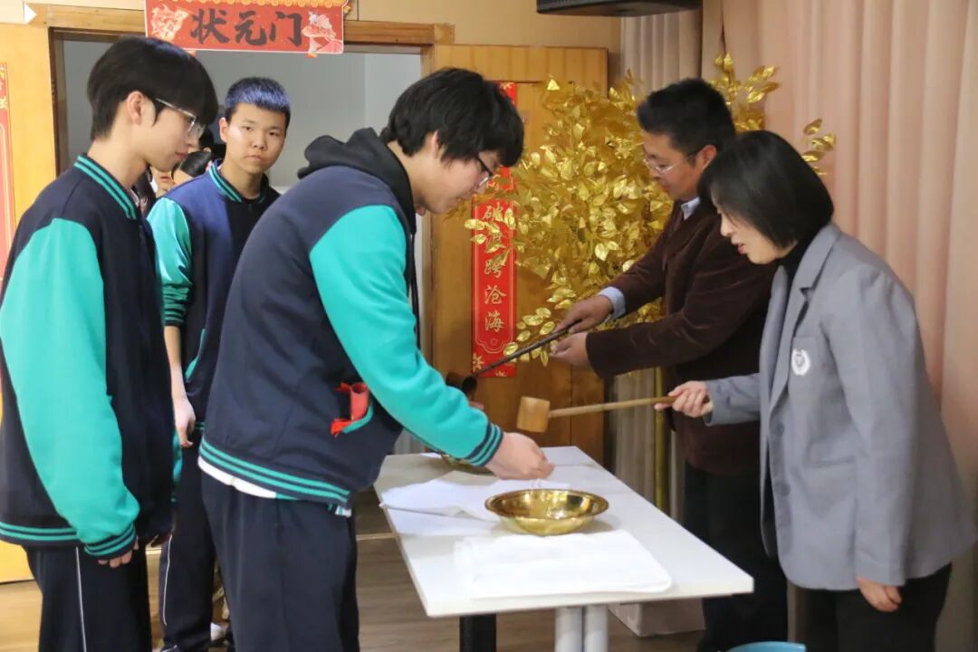 悠扬古筝曲流淌,邱建辉老师现场挥毫泼墨,书写励志对联为学子鼓劲,许愿牌在灯光下熠熠生辉,静待六月绽放芳华。