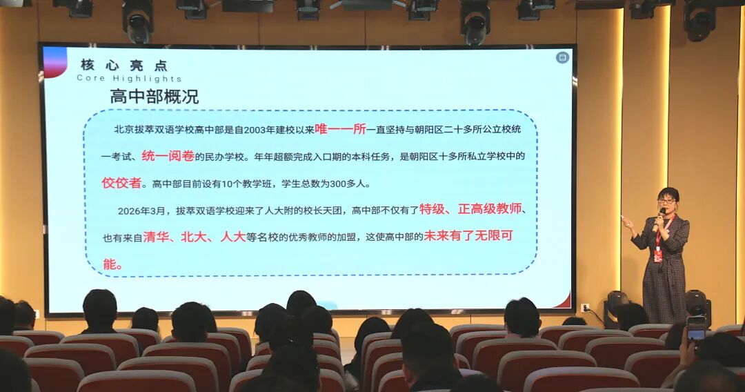 丁利书记首先致欢迎辞,向到场家庭致以诚挚问候。她介绍,作为朝阳区四大未来科学家项目之一,拔萃学校凭借优质办学实力,跻身朝阳区教育“顶流”,这是对学校办学成果的高度认可。