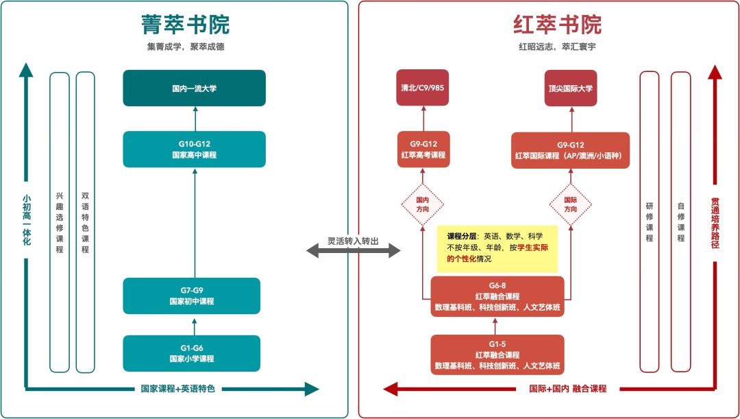 围绕这一目标,学校对课程进行顶层重构,实现1—12年级贯通培养,开齐开足国家课程,以“早培+双语+人工智能”为特色,打通基础课程,将个性化研修课纳入常规课表,让因材施教落地日常。同时设立红萃书院、菁萃书院双轨体系,符合条件的红萃生可直升高中,为孩子搭建稳定、优质、连贯的成长通道。