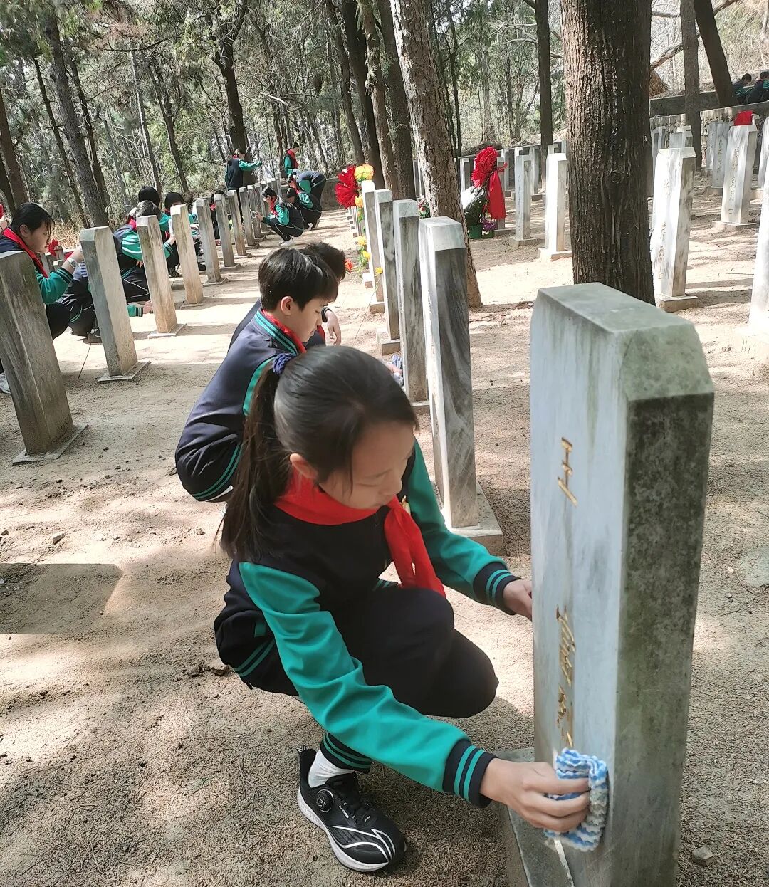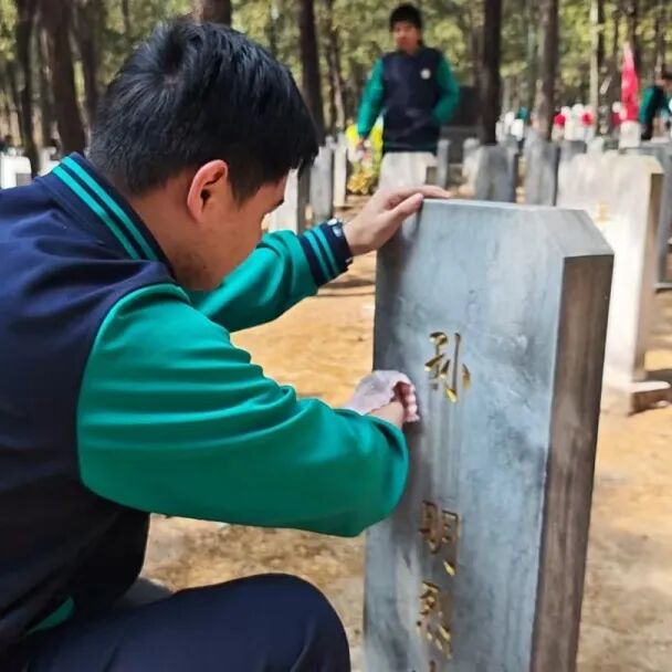 当擦到碑文上与自己同龄的年月时,很多同学手中的动作慢了下来,有的同学潸然泪下,有的同学眼神重新变得坚定,每一次擦拭的动作都格外认真。阳光落在擦净的碑面上,泛起温润的光,像年轻的烈士们从未远去的目光。
