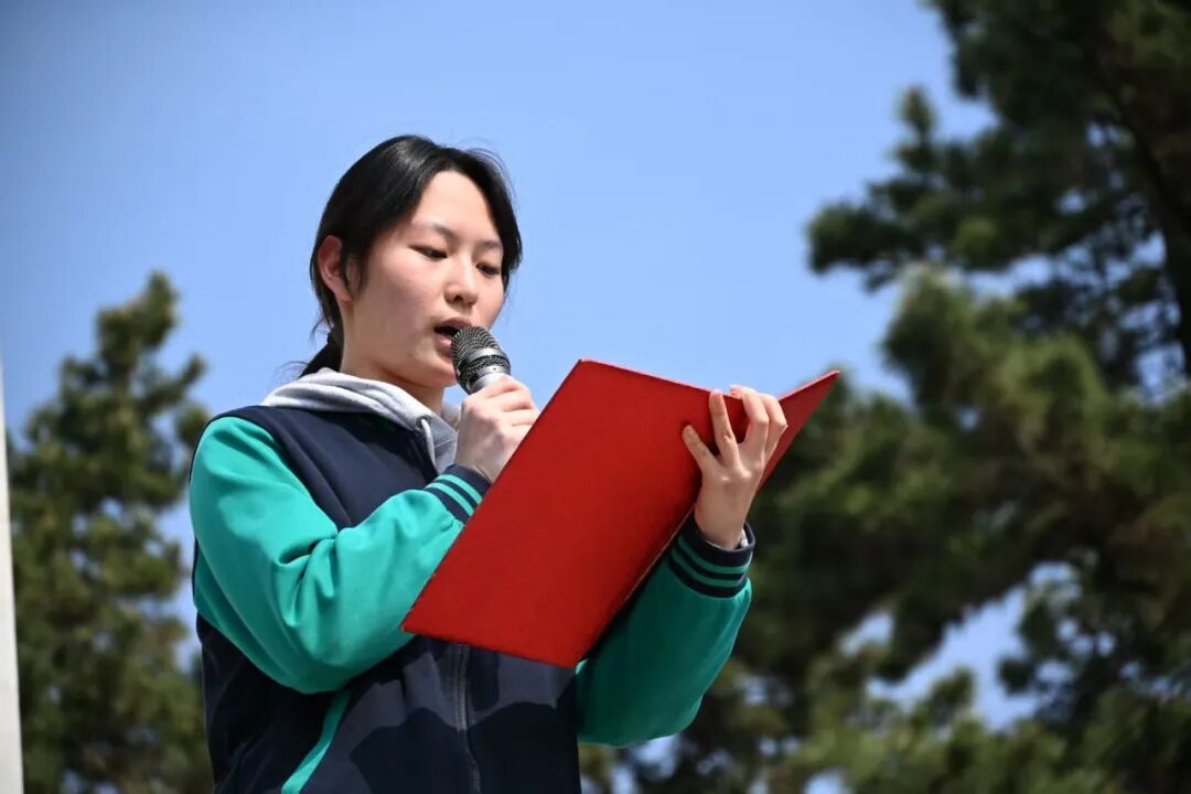 高三3班郑佳蔚同学作为学生代表发言:拔萃校训不是挂在墙上的标语,而是今天的我们站在这里的理由,拔萃学子不仅要赓续红色血脉,更要为国家富强、民族振兴、人民幸福而学习。铿锵有力的发言,表达了青年一代传承英烈精神、不负时代韶华的坚定决心。