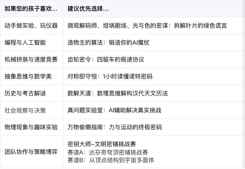 最后,我们仍然会附上课程选择指南,建议先收藏,今晚和孩子聊过后再报名。